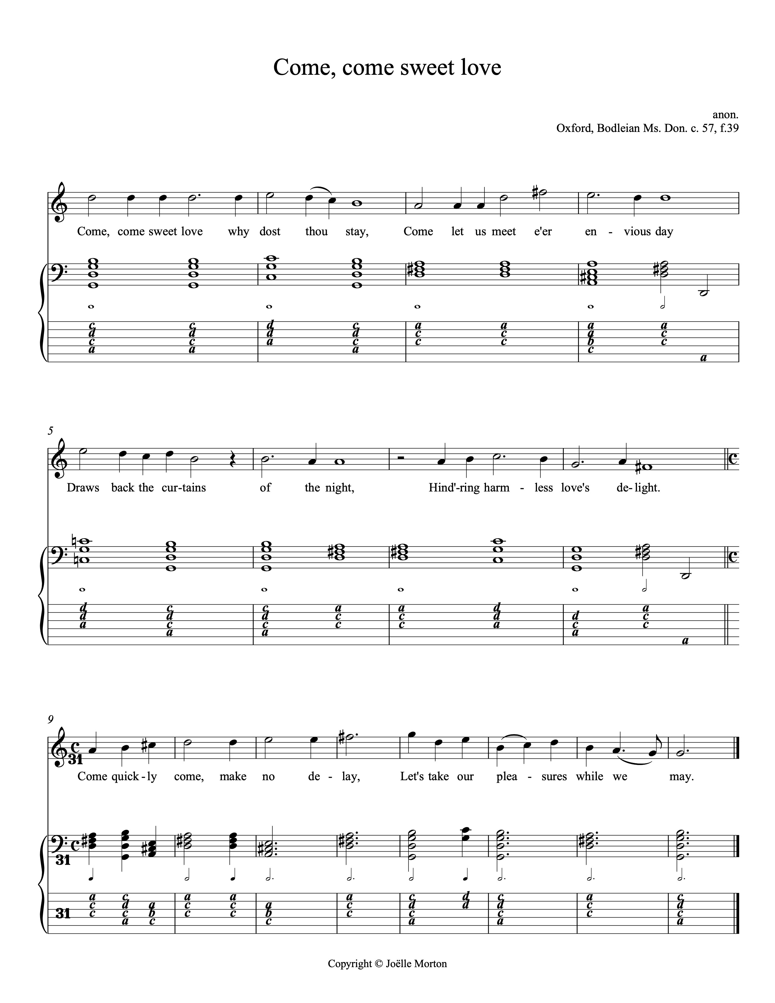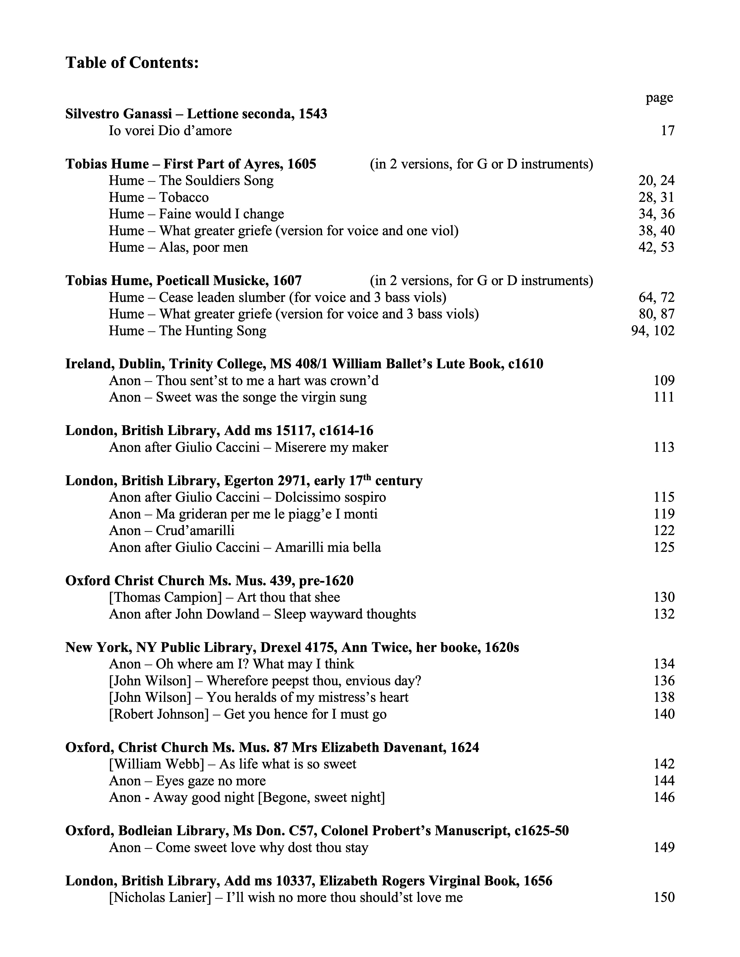 There are close to 30 songs for a single voice with a single viol as accompaniment and all but one employ the viol in its normal tuning. Some are songs that were known and loved in other settings (such as music by Guilio Caccini or John Dowland), and others are unica, that do not appear to exist in any other known versions. Most are for a treble voice, but several exploit unusually large and/or particularly low ranges. There are remarkably few additional songs where a viol is necessary in scordatura, or where the lyra viol is part of a larger continuo team. This anthology contains everything that I know of for the single voice + viol in a normal tuning combination.